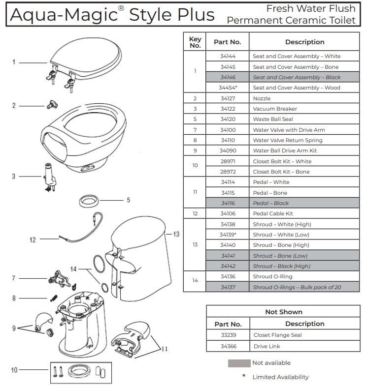 Installation is quick and simple, with compatibility across most standard RV plumbing systems. The Aqua-Magic Style Plus is also supported by a full range of genuine Thetford replacement parts and service kits, including water valves, seals, pedals, and flush modules — making maintenance easy and cost-effective.