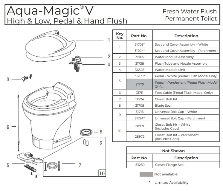 The Thetford Aqua-Magic V is a reliable and space-efficient RV toilet designed for comfort, durability, and consistent performance on the road. Perfect for motorhomes, travel trailers, and fifth wheels, this toilet offers a compact design while maintaining full functionality for everyday use.